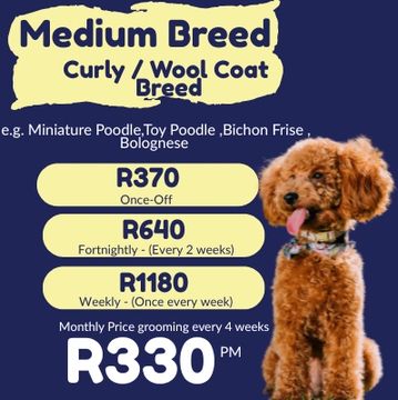 e.g. Miniature Poodle, Toy Poodle, Bichon Frise, Bolognese